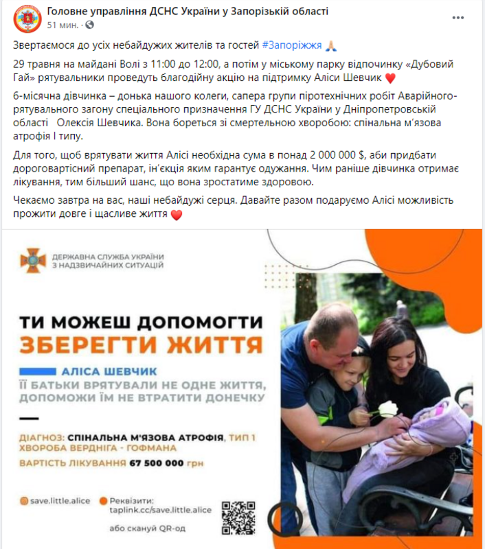 Завтра в Александровской районе Запорожья состоится благотворительная акция в поддержку 6-месячной Алисы Шевчик. У девочки смертельная болезнь – спинальная мышечная атрофия первого типа. Об этом сообщают в пресс-службе ГСЧС, передает "ZаБор".