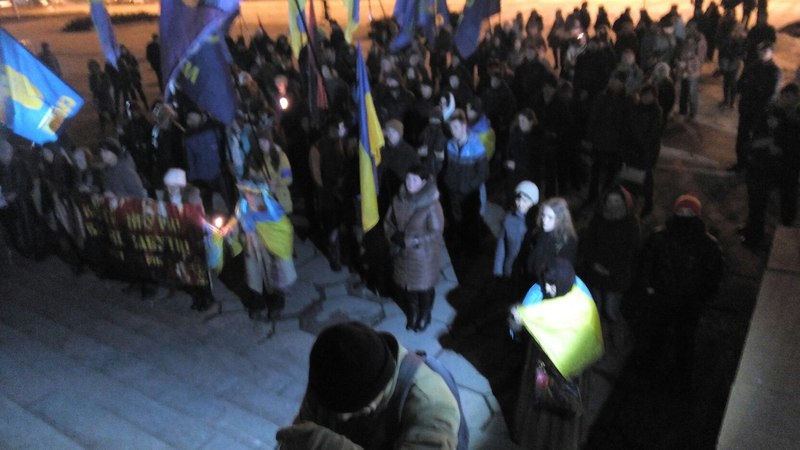 На пл. Фестивальной активисты почтили память погибших герове под Крутами, Небесной Сотни, а так же - погиших на войне Украины с Россией. Среди выступающих был глава городской организации "Свобода" Виталий Подлобников, который так же упомянул об идущей на Востоке войне, а так же-высказал легкую обиду на власть.