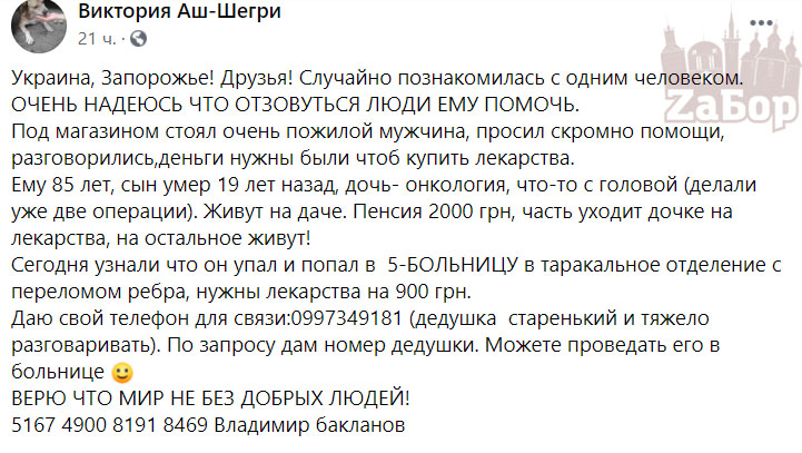 В соцсети Виктория Аш-Шегри опубликовала пост, в котором просит помочь пожилому мужчине. Она рассказывает, что у него 19 лет назад умер сын, а дочь болеет онкологией. Живут они на его пенсию в размере 2000 гривен, часть уходит дочери на лечение. Вчера мужчина упал и попал в больницу с переломом ребра, ему требуются лекарства, сообщает "ZаБор".