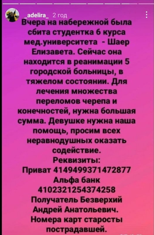 Так, стало известно, что девушку зовут Елизавета, она учится на 6 курсе в медуниверситете. Сейчас она находится в реанимации 5 горбольницы в тяжелом состоянии.