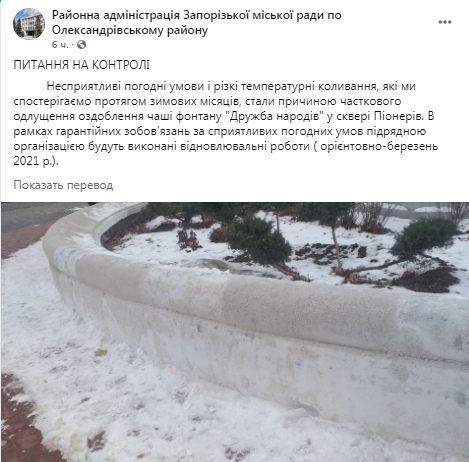 Осенью 2020 года была проведена реконструкция в сквере на "Анголнеко". В ходе реконструкции обновили и памятник пионерам, но уже покрытие бортиков бывшего фонтана начало отслаиваться. В районной администрации Запорожского областного совета по Александровскому району назвали причину, почему покрытие испортилось, передает "ZаБор".