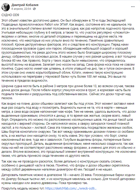 "СУДНО OD9" (так его условно обозначили) находится в неидеальном состоянии, на это влияет положение судна, находится оно, как раз напротив лодочного причала. Из-за того, что глубина небольшая, всего 6 метров, а также то, что на участке "утюжатся" якоря и сети, многие из деталей оторваны или перемещены на другие места, не исключено даже то, что некоторые из них уплыли вниз по течению, отмечает Дмитрий Кобалия.