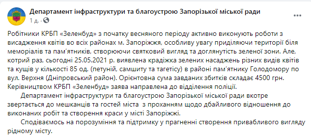 Теперь же вырывать цветы начали и около памятников. 25 мая, была обнаружена кража зеленых насаждений разных видов цветов и кустов. Так, неизвестные вырвали 85 единиц петуний, самшита и тагетеса. Произошло это в районе памятника Голодомора по улице Верхняя.