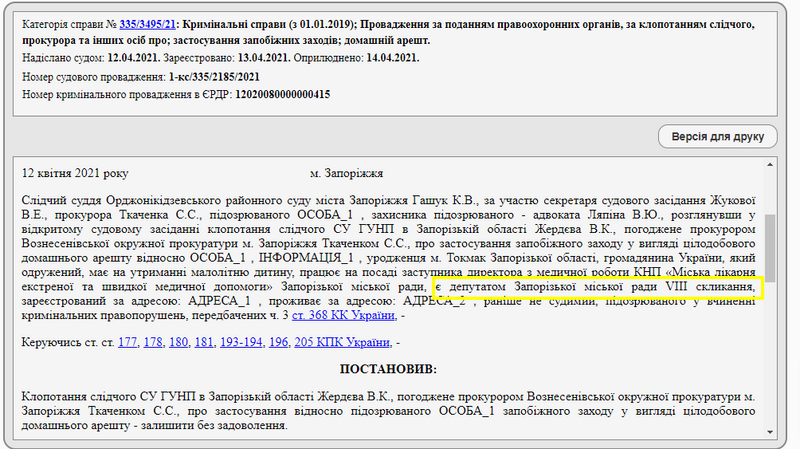 В судебном реестре появилось определение, где одному из подозреваемых следствие хотело заменить личное поручительство на круглосуточный домашний арест. В документе указано, что подозреваемым является депутат горсовета пятого созыва.