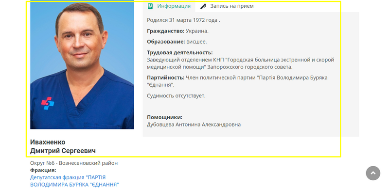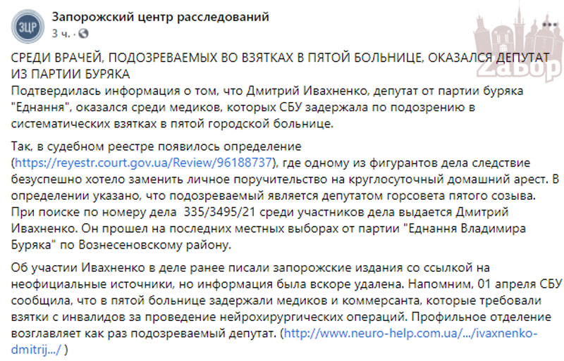 На официальной странице в соцсети "Запорожского центра расследований" стало известно, что среди врачей, которые требовали взятки, был и депутат из партии "Еднання" Владимира Буряка. Так, информация о том, что Дмитрий Ивахненко оказался среди медиков-взяточников, подтвердилась.