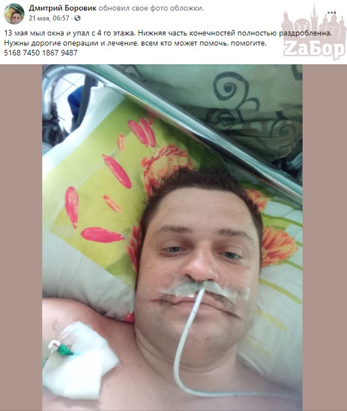 На своей странице Фейсбук Запорожец Дмитрий Боровик просит о помощи для себя. Он упал с 4 этажа и ему нужны дорогие операции, передает "ZаБор".