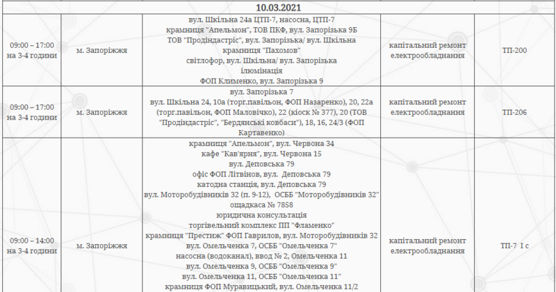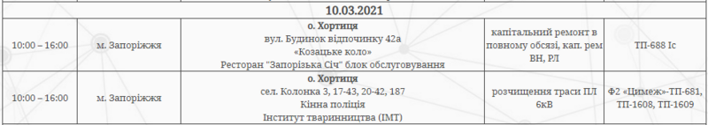 Так, 9,10 и 11 марта в связи с ремонтными работами ПАТ "Запорожьеоблэнерго" жители города останутся без света. Массовое отключение будет в Александровском, Шевченковском районах и на Правом берегу. Об этом стало известно на сайте ПАТ "Запорожьеоблэнерго".