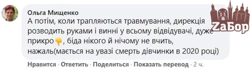 В комментариях пользователь отмечают, что когда случаются травмирования, дирекция разводит руками и во всем виноваты посетители: "А потім, коли трапляються травмування, дирекція розводить руками і винні у всьому відвідувачі, дуже прикро , біда нікого й нічому не вчить, нажаль(мається на увазі смерть дівчинки в 2020 році)".