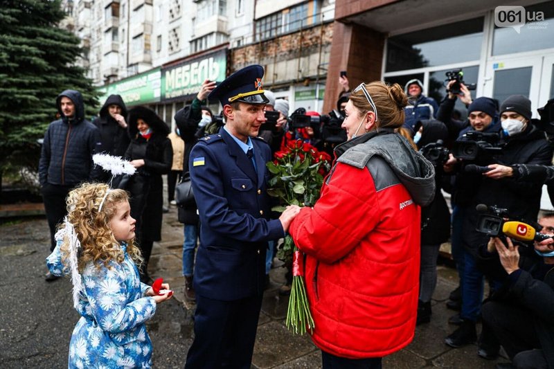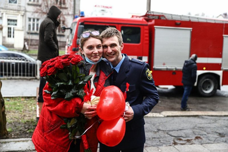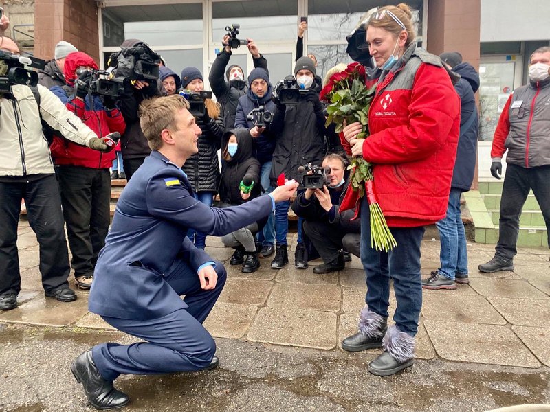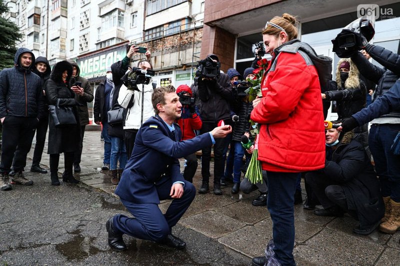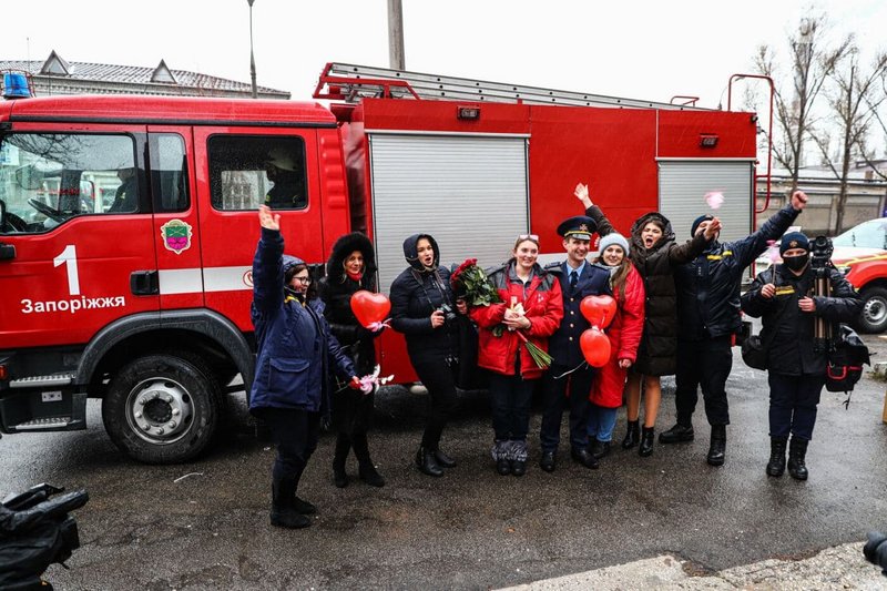 Так, лейтенант службы гражданской защиты, сотрудник ГСЧС Украины в Запорожской области Владислав Коренця, решил сделать предложение руки и сердца своей возлюбленной Ирине Чепурной. Он подарил ей букет цветов и кольцо, она сказала "Да!".