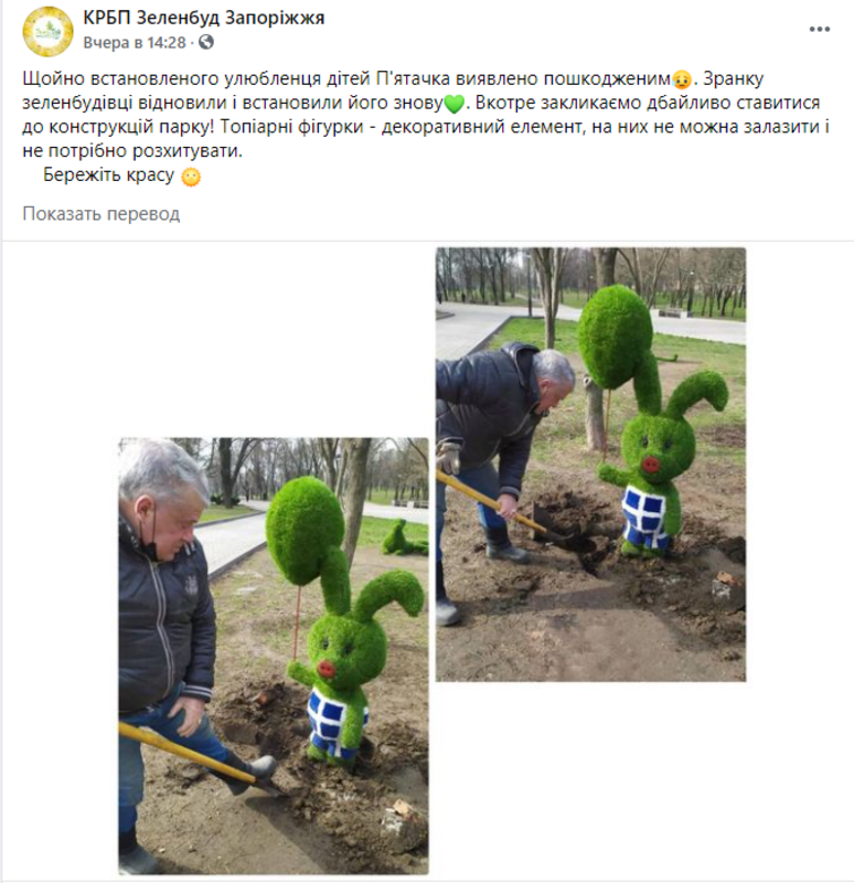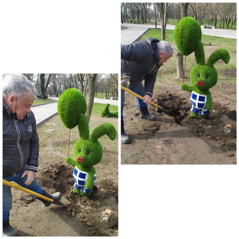 В Запорожье в парке Трудовой Славы, спустя 2 дня после установки, уже сломали одну зелёную фигуру