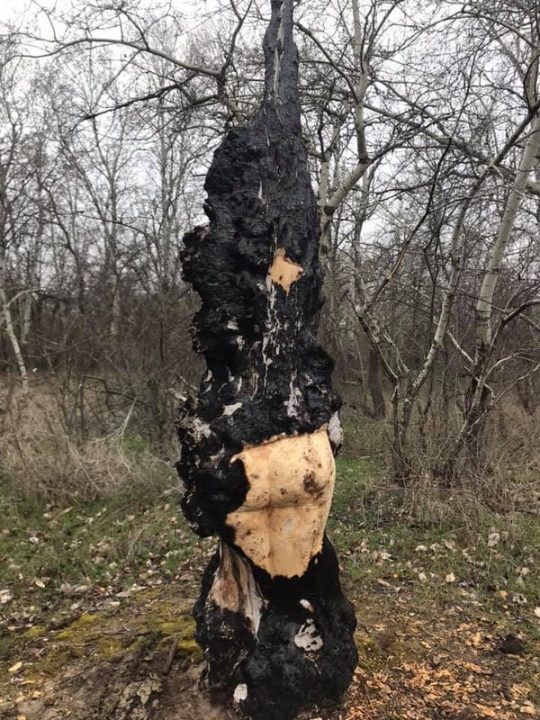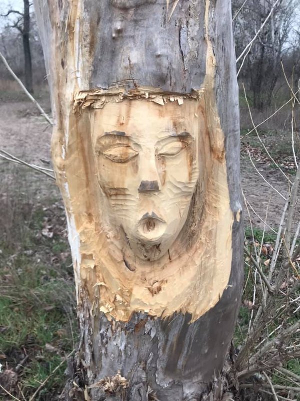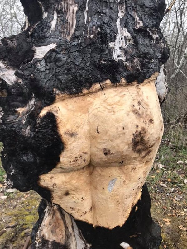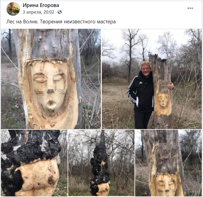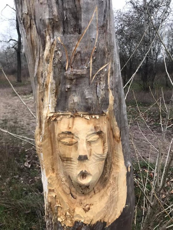 Находкой поделилась в Сети известная запорожская журналистка Ирина Егорова. Так, лесополосу на Гребном канале-Волне уже несколько лет уничтожают сильные пожары. На обгоревшем стволе дерева неизвестный мастер изобразил интимную часть женской фигуры, а на другом женское лицо. Стоит отметить, что лицо, напоминает женщину из индийского племени.