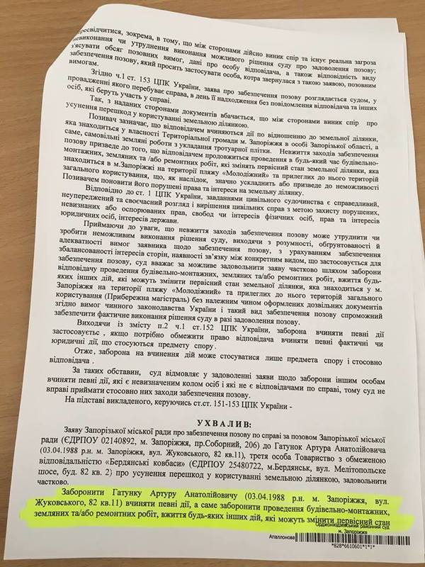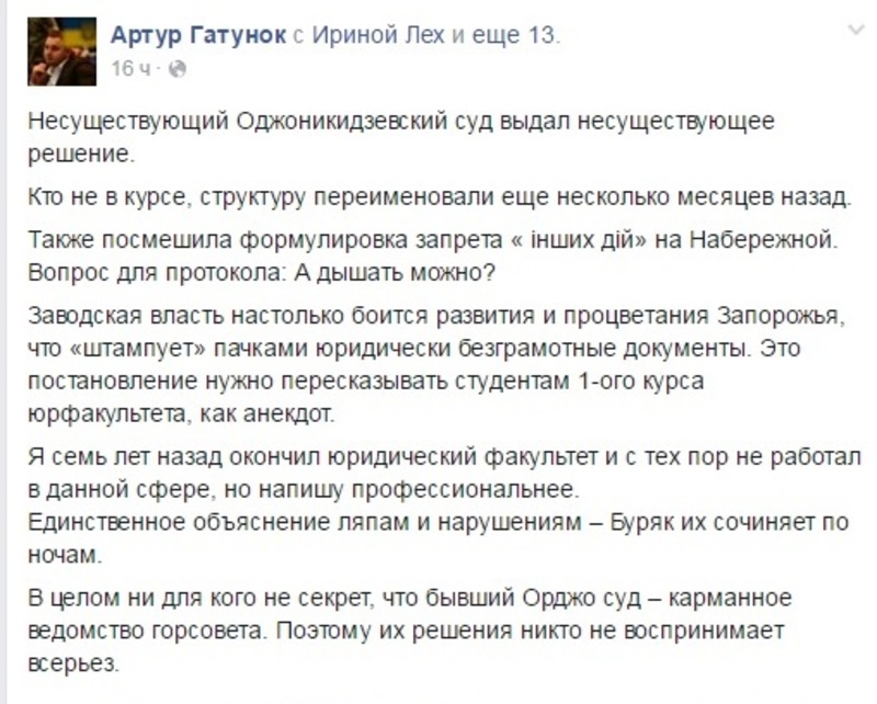 Так или иначе, сам Гатунок на своей страничке в фейсбук заявлявлял о незаконности данных постановлений (о запрете на проведение работ на запорожском пляже и прилегающим к ним территориям), а также - откровенно высмеивал решение суда. "В целом ни для кого не секрет, что бывший Орджо суд - карманное ведомство горсовета. Поэтому их решения никто не воспринимает всерьез" - пишет на своей страничке в соц сети депутат.