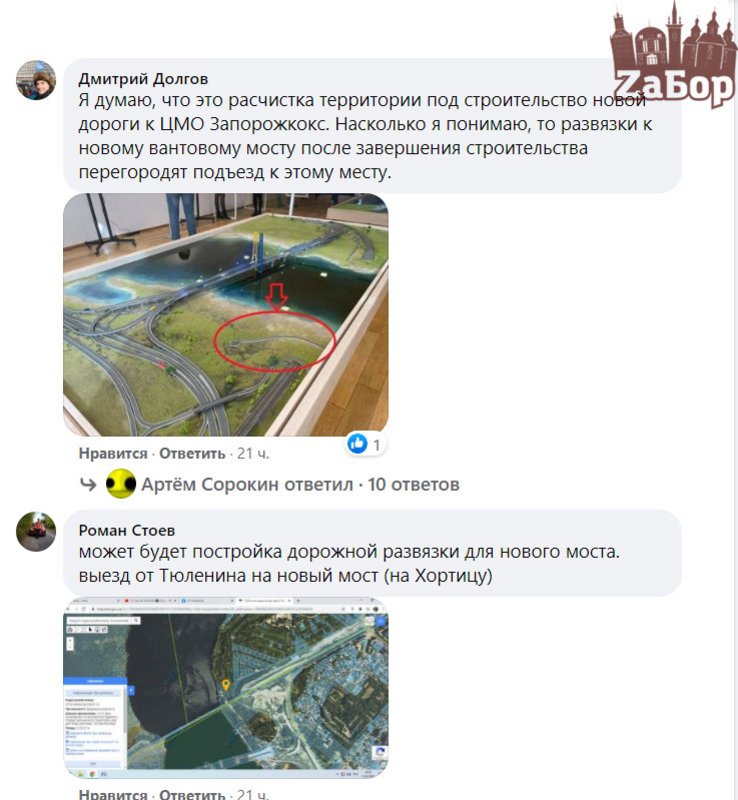 В комментариях предполагают, что это может быть расчистка территории под строительство новой дороги к ЦМО Запорожкокс или постройка дорожной развязки для нового моста (выезд от Тюленина на новый мост).