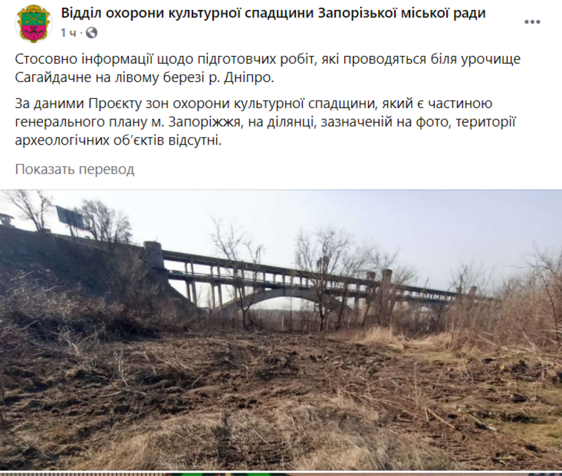 А на странице Фейсбук отделения культурного наследия Запорожского горсовета отмечают, что касаемо подготовительных работ, которые проводятся в урочище Сагайдачного на левом берегу Днепра по данным проекта зон охраны культурного наследия, который является частью генерального плана города Запорожье, на участке обозначенным на фото, территории археологические объекты отсутствуют.