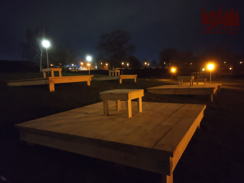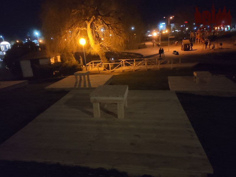 В Вознесеновском парке на склоне, где обычно устраивают выставку цветов на Покровскую ярмарку начали устанавливать помосты, на которых есть небольшие столики. Похоже это на летнюю площадку.