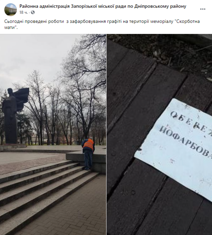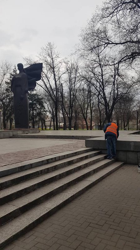 В Запорожье вандалы изуродовали мемориал "Скорбящая мать" и коммунальщики приводили его в первозданный вид (фото)