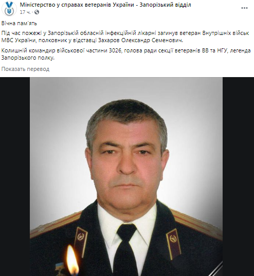 В Запорожье во время пожара в "инфекционке" погиб бывший командир воинской части Нацгвардии