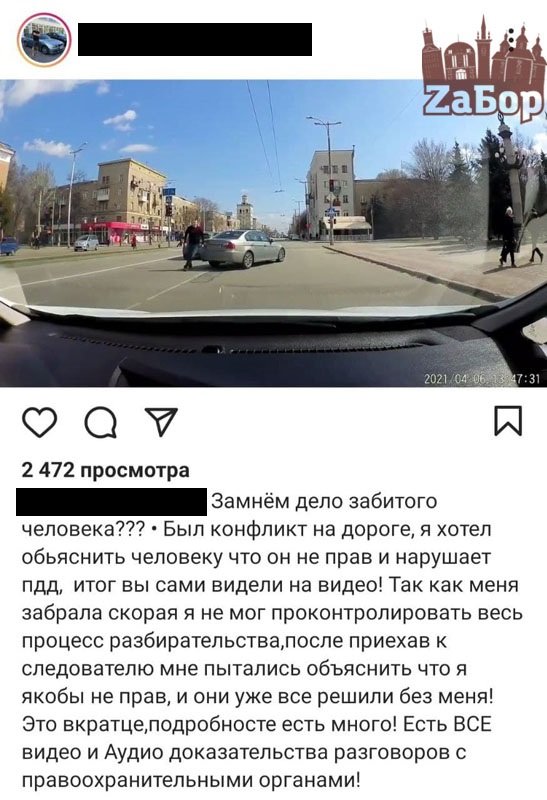 ДТП произошло на днях. По словам одного из водителей, на дороге между ним и другим водителем произошел конфликт. В результате чего мужчина затормозил посреди проспекта и пошел разбираться (по его словам) с нарушителем. По итогу второй водитель решил не выходить из машины, а просто сбить первого, после чего он просто уехал. Об этом стало известно из соцсети, передает "ZаБор".