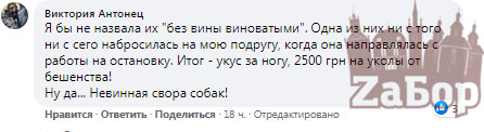 Также, пользователи говорят о том, что одна из собак просто так набросилась на девушку и укусила ее за ногу, в результате чего, пострадавшей кололи уколы от бешенства (2500 грн было потрачено на уколы).