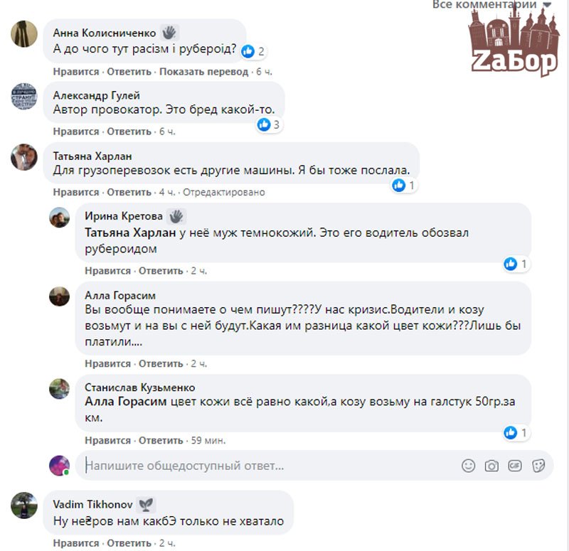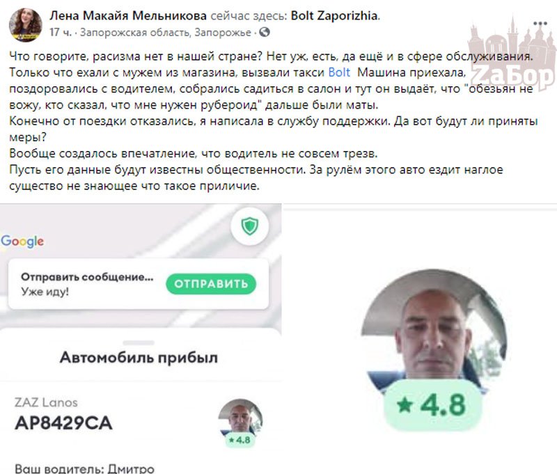 14 апреля Елена Макайя-Мельникова и ее муж вызвали такси. Супруг у запорожанки – родом из Конго. Цвет его кожи и послужил для таксиста фактором раздражения. Так, женщина рассказывает, что вместе с мужем ехали из магазина и заказали такси компании "Болт". Приехала машина, они поздоровались с водителем и как только собирались садится в машину, мужчина сказал "обезьян не вожу, кто сказал, что мне нужен рубероид", дальше были маты, - говорит женщина.