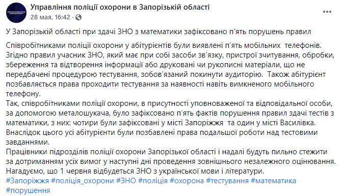 На прошлой неделе в Запорожской области состоялось Внешнее независимое оценивание по математике. Так, сотрудники полиции охраны зафиксировали 5 нарушений. 4 в Запорожье и 1 в Васильевке. Об этом сообщают на странице Управления полиции охраны в Запорожской области, передает "ZаБор".