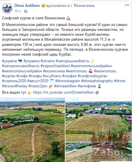 Запорожский блоггер ездит по области, изучая достопримечательности регионов, в частности скифские курганы. На днях Дмитрий Антифеев посетил село Вознесенка Мелитопольского района, где расположен один из самых больших курганов Запорожской области, сообщает "ZаБор".