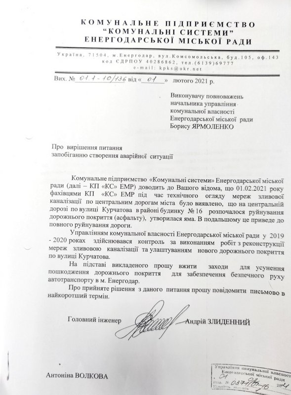 Заказчиком работ было управление коммунальной собственности, оно же контролировало качество их выполнения, КП "Коммунальные системы" обратилось в УКВ с соответствующим письмом по ситуации. Ведь если проблему не устранить в ближайшее время, то в дальнейшем это приведет к разрушению дороги.