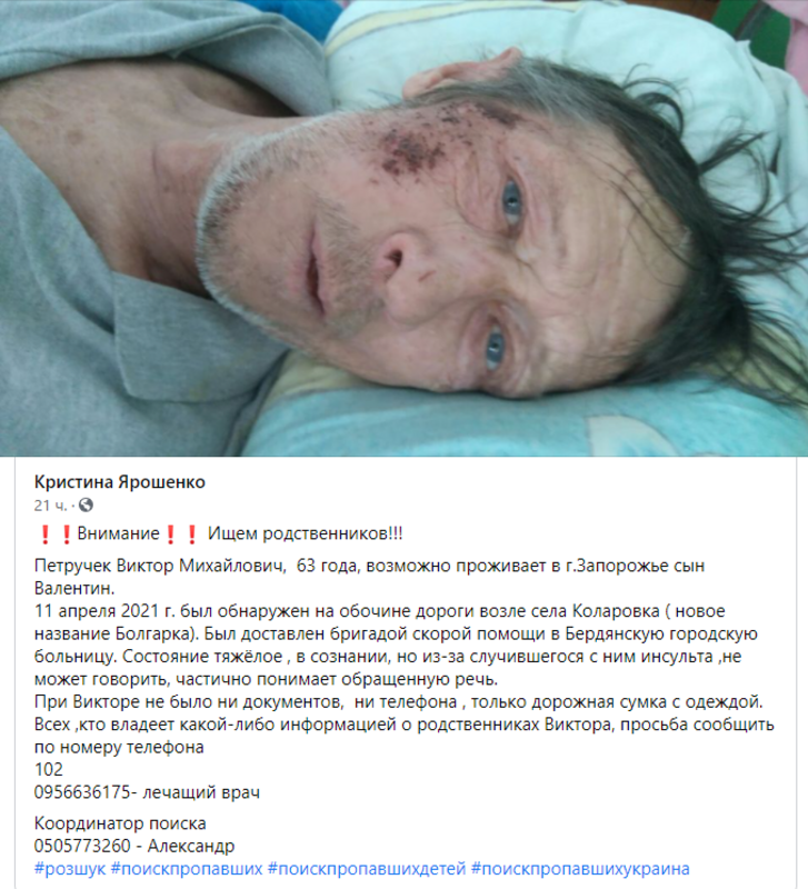 11 апреля 2021 года на обочине дороги возле села Коларовка (новое название Болгарка) нашли 63-летнего Петручека Виктора Михайловича. Волонтеры предполагают, что в Запорожье может проживать его сын Валентин.