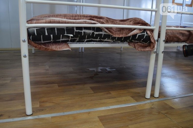 На демонстрации условий домиков журналисты запорожского портала "061" заметили, что крыша новенького строения - течет. Так под кроватью образовалась немаленькая лужа. А украшением стен строений стал портрет президента Украины и его мотивирующие цитаты.