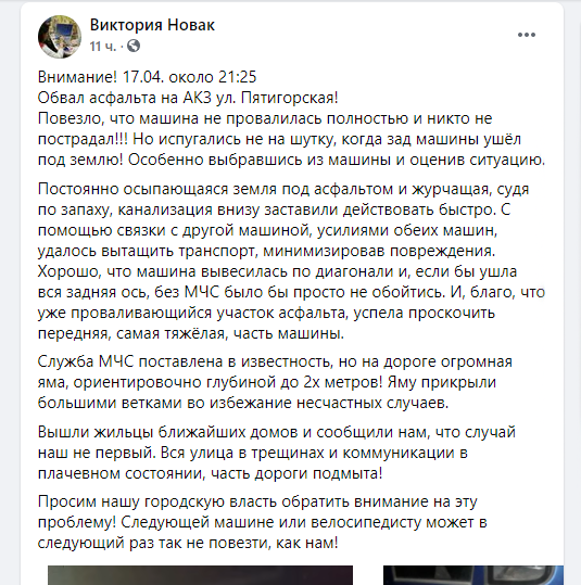 Очевидцы вовремя заметили обрушение, машину удалось вытащить без помощи сотрудников ГСЧС, хотя спасателям о происшествии сообщили. В результате инцидента, пострадавших нет. Сама же яма глубиной до 2-х метров. Ее прикрыли большими ветками во избежиние несчастных случаев.