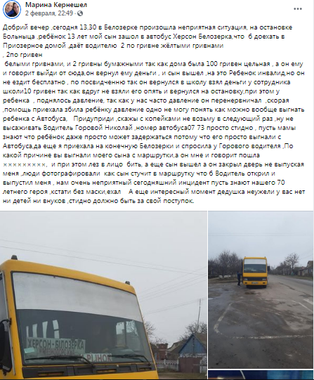2 февраля в пгт Белозерка произошел неприятный инцидент. Водитель автобуса "Херсон-Белозерка" выгнал из салона автомобиля ребенка с инвалидностью. Это вопиющий случай активно обсуждается в запорожских пабликах. Об происшествии сообщила мама мальчика в соцсети Фейсбук, передает "ZаБор".