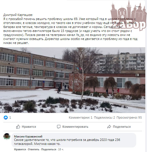 В соцсети разместили пост с просьбой помочь решить проблему в школе №69 Днепровского района. По словам автора, там уже не первый год проблемы с отоплением, сообщает "ZаБор" .