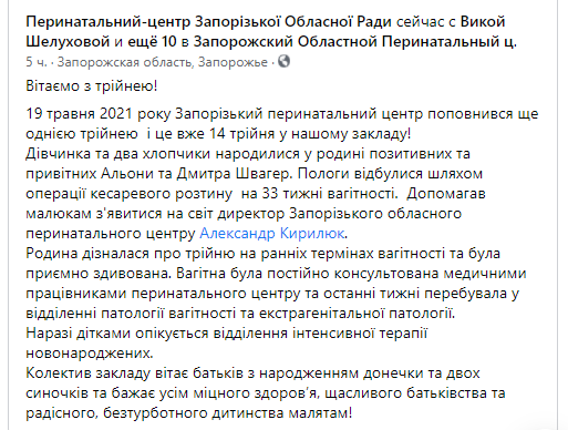 19 мая в Запорожском областном перинатальном центре на свет появились два мальчика и одна девочка. Появились малыши в семье Алены и Дмитрия Швагер.
