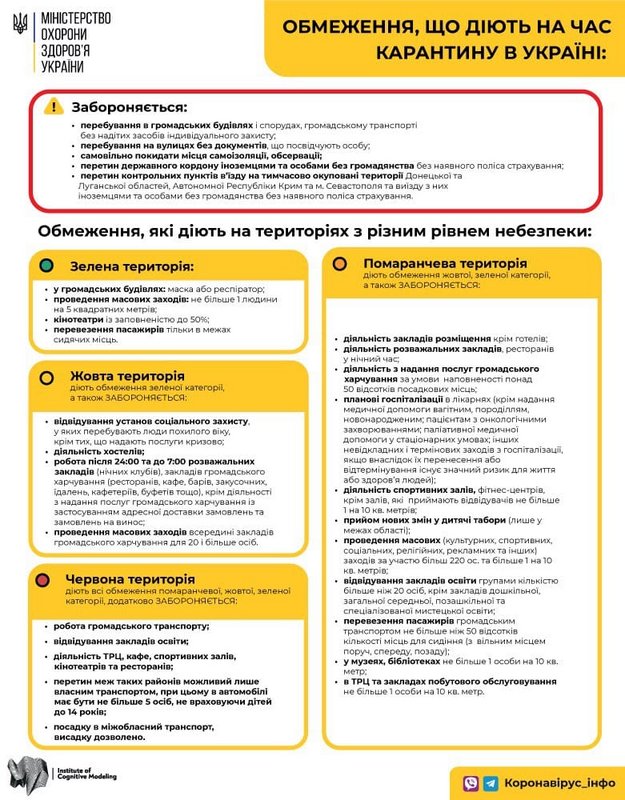 В "желтой" зоне, необходимо было следить за тем, чтобы кинотеатры были заполнены наполовину, в общественном транспорте использовались только сидячие места, люди носили маски или респираторы и находились на расстоянии не менее 5 кв. м друг от друга в общественных местах и во время проведения мероприятий. А также запрещено посещать учреждения соцзащиты, в которых находятся пожилые люди.