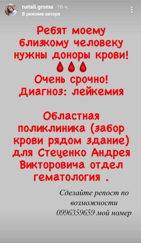 Соответствующим постом на своей странице поделилась девушка. Она просит о помощи для своего близкого человека Стеценко Андрея Викторовича, у него лейкемия. Очень срочно требуются доноры крови.