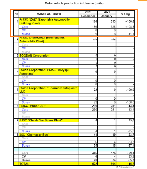 В январе 2021 года Запорожский автомобильный завод стал лидером среди отечественных производителей автомобилей, он даже обогнал Еврокар, который выпустил всего 251 машину.