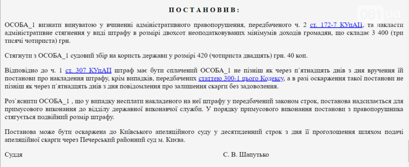 Суд признал Никитину виновной по ч.2 ст. 172-7 КУАП. Согласно решению суда, депутат допустила реальный конфликт интересов после того, как подписала вышеуказанную просьбу. Так, Марина Никитина должна оплатить штраф в размере 3400 гривен.
