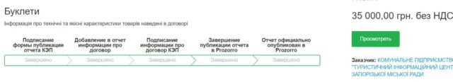 За полтора года Запорожский туристический информационный центр, который находится по адресу проспект Соборный, 151 заказал печатную продукцию на 61 960 гривен. В это стоимость входит заказ афиши на сумму 12 960 гривен, а также брошюр на 14 000 и буклетов на 35 000 гривен.