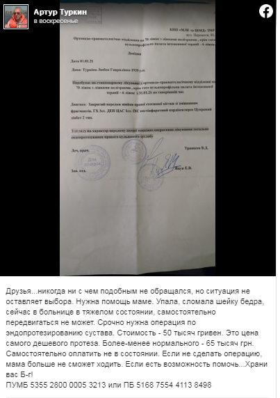 В своем посте журналист отмечает, что стоимость одного самого дешевого протеза 50 тысяч гривен. "Никогда ни с чем подобным не обращался, но ситуация не оставляет выбора. Нужна помощь маме. Упала, сломала шейку бедра, сейчас в больнице в тяжелом состоянии, самостоятельно передвигаться не может. Срочно нужна операция по эндопротезированию сустава. Стоимость — 50 тысяч гривен. Это цена самого дешевого протеза. Более-менее нормального — 65 тысяч гривен. Самостоятельно оплатить не в состоянии. Если не сделать операцию, мама больше не сможет ходить", - пишет журналист.