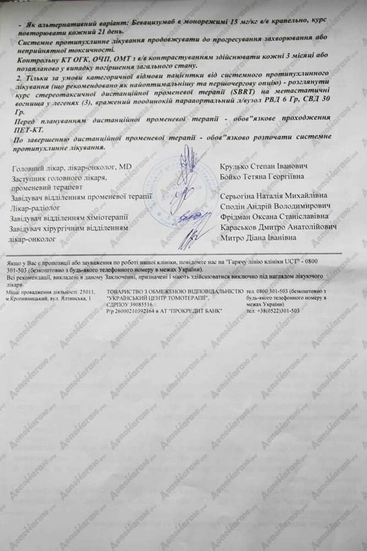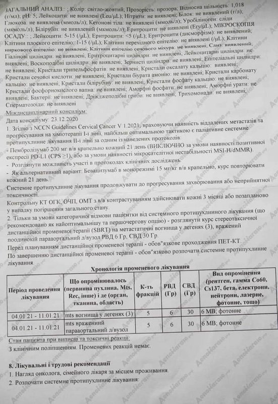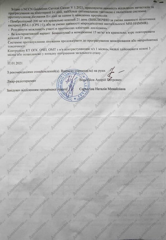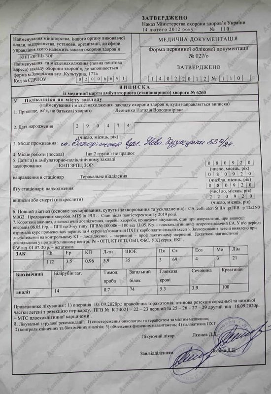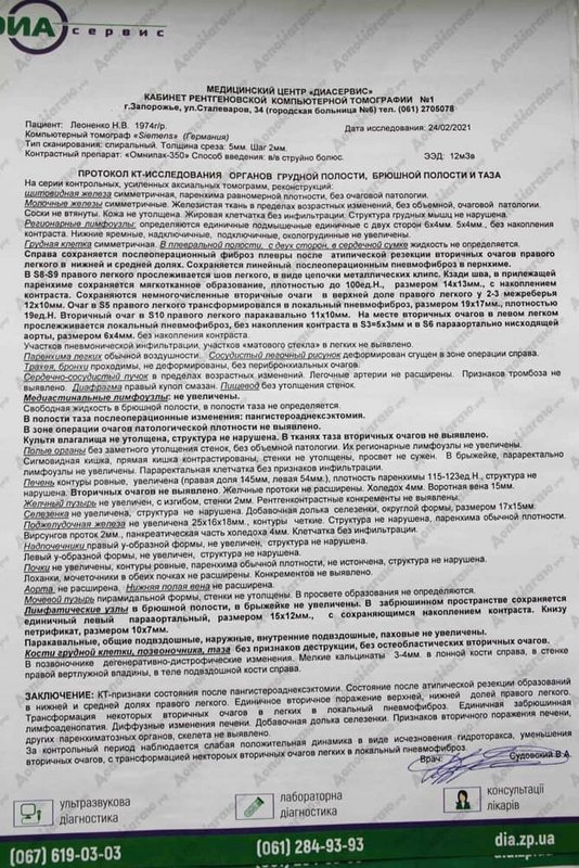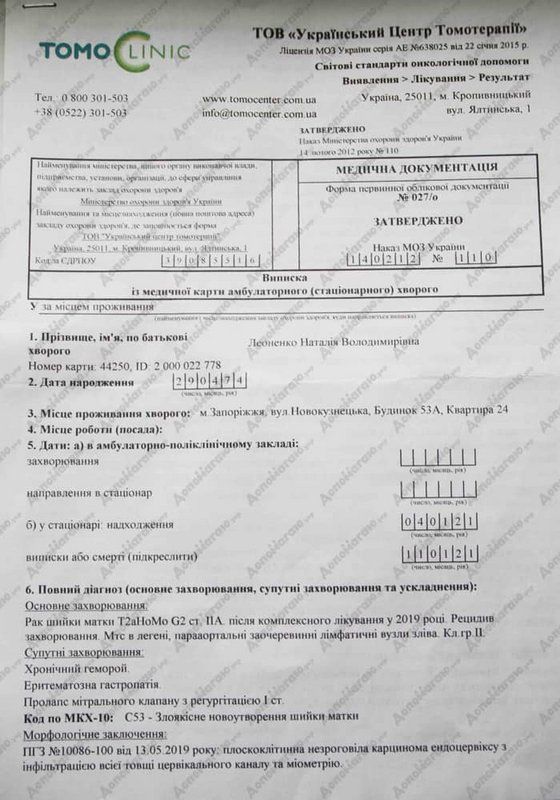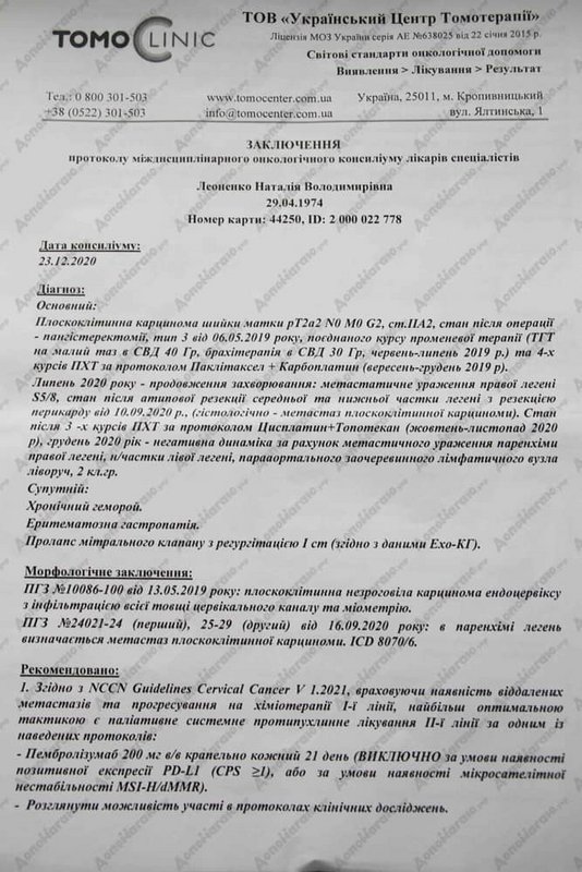 В декабре 2020 года на плановом обследовании у нее выявили метастазы в легких, тогда Наталья прошла лучевую терапию в Кировоградской области в клинике "TomoClinic". "Це мені продовжило життя і виграло час, щоб спробувати імунотерапію – це зараз моя єдина рятівна соломинка!", - отмечает Наталия.