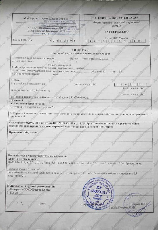 Леоненко Наталия – запорожская журналистка, работала на бывшем телеканале "ТВ Голд". У Наталии обнаружили рак шейки матки, ей необходимо дорогостоящее лечение в размере 276 000 гривен. Со страшной болезнью Наталья борется уже 2 года, она прошла 2 тяжелых операции, 7 курсов химиотерапии, облучение.