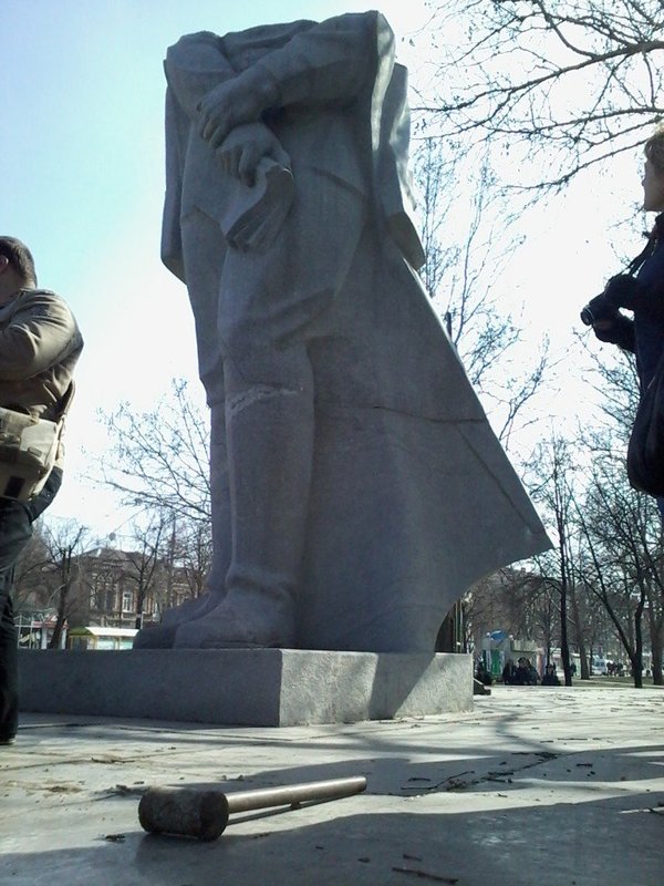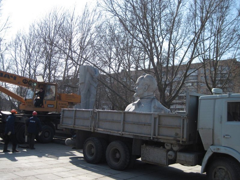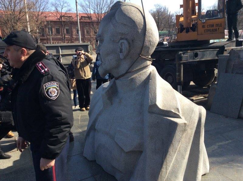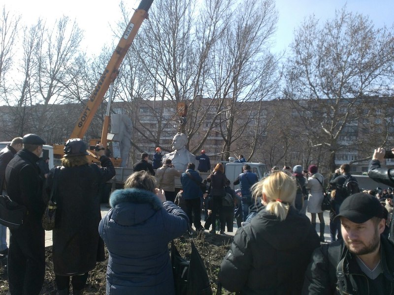 Снос начался около 9 утра. Памятник огорожен забором. На площади Свободы, где установлен памятник, присутствует несколько десятков человек, кран, машины коммунальщиков и два полицейских авто. Некоторые активисты пришли на площадь с шампанским, которым будут отмечать успешное начало демонтажа памятника. Кроме этого, наблюдают за процессом и депутаты городского совета.